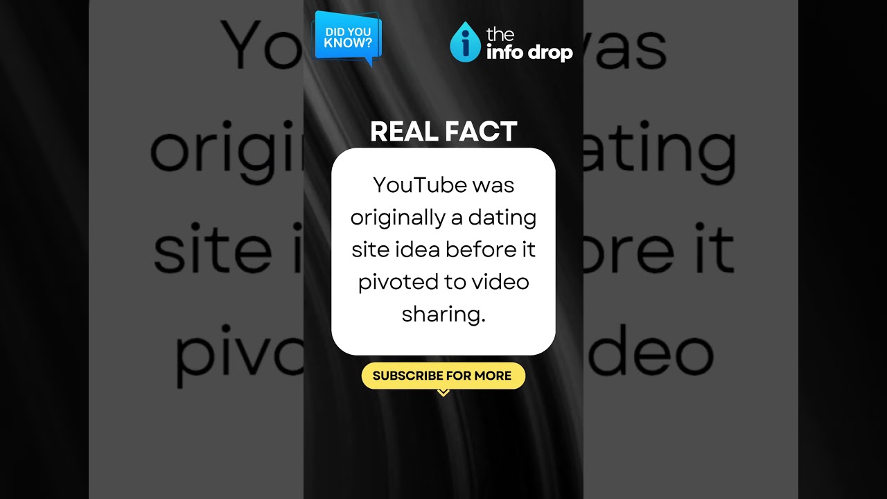 REAL FACT: YouTube was originally a dating site #youtube #techfact 전일미디어 0 1067 05.26 00:06 https://youtu.be/BqS3WX6yNWQ + 359 YouTube was originally a dating site idea before it pivoted to video sharing. #trending #theinfodrop #datingsites #youtube ...